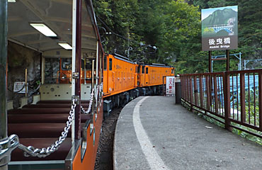 帰りの都合もあって、車はアルペンルートの西の基点・立山駅の駐車場(無料)に置き、富山地方鉄道を乗り継いで宇奈月温泉へ。 そこからトロッコ電車に乗り換えて欅平へ入る。紅葉シーズンのピークを外して来ただけに、トロッコはガラガラで、1車両に1人か 1グループしか乗っていない状態だった。