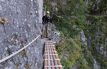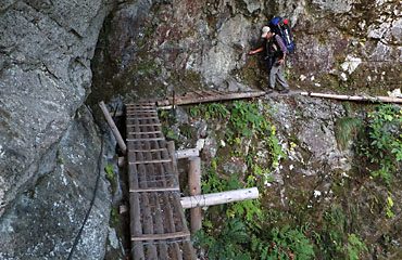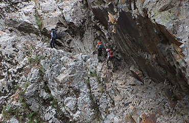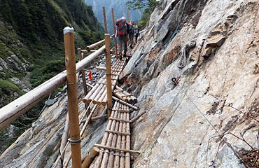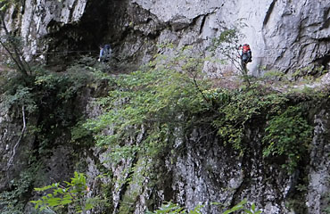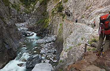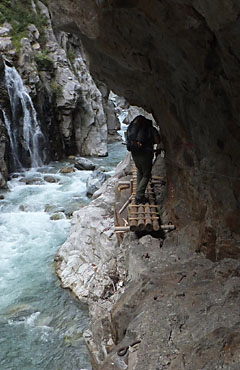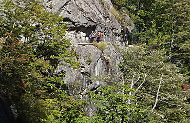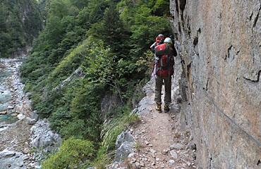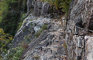 水平歩道は最初のうちは森林帯だが、すぐにアドレナリン出まくりの絶壁コースに 模様替えする。垂直に近い岩壁に幅0.5〜1m、高さ2〜3mの、”コ”の字型にくり抜いた道が延々と続く。