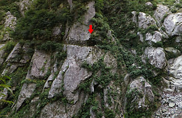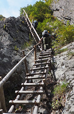 亀裂が入って崩れそうになったため、ハシゴで高巻き している。岩の頭