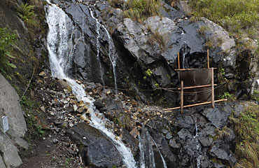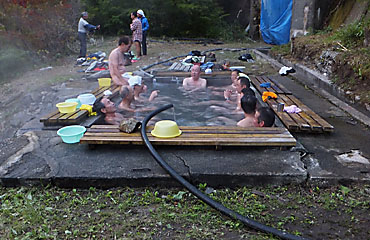 さて、次なる目的は温泉である。湯船は一つしかないので、男女1時間単位で交代で利用することになる。温泉までは小屋から歩いて 10分ほどかかる。湯船やその周りはよく手入れされていて、清潔感で不安なところはない。2本のホースでお湯が引かれていて、片方 は熱め、もう一方(画像手前)はぬるいお湯が注がれているので、場所を選べば好みの湯温が得られる。