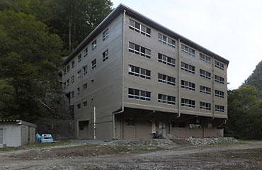 1kmほど進むと、今度は一転して急勾配の下りとなる。100mほど下ると黒部本流の間近に降り立つ。上流に向かって少し進むと、 「こんなところにマンションが・・・」と思いたくなる立派な建物に行き当たる。すぐ近くの仙人谷ダムや黒四発電所に詰める人 のための宿舎らしい。更に進むと建屋内に進むよう指示があり、やがてトンネルに入る。200mほど進んだところで外に出るが、 そこが仙人谷ダムである。