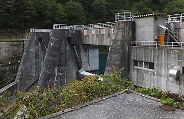 仙人谷ダム。幅80m、高さ50mほどの小さなダムである。