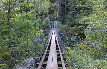 ダムを渡って対岸(右岸)に渡り、1kmほど進むと吊橋に行き着く。