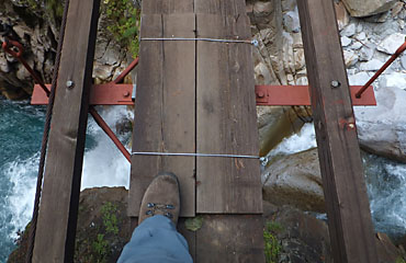 踏み板の隙間から直下の沢が透けて見えて高度感は際立つ。