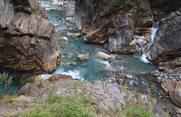 左下から流れ込むのは剱沢で、これを遡ると剱岳に行き当たる。こちらは上流の大雪渓や氷河の雪解けが進行中らしく、 水量は非常に多かった。