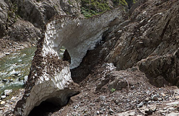 全ルートを通じて最後まで雪渓が残り、通行可能となる時期を左右するのが この場所。例年9月中旬まで道を塞いでいるそうな。