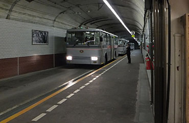 案内板の示すままにトンネルに入り、何回か右左折を繰り返すとパッと目の前が明るくなりトロリーバスが目に入った。 良かった〜〜〜。これで歩きも終わりだ〜・・・・と思ったら、そんなに甘くはなく、押し寄せる観光客を掻き分けながら更に 5分ほど歩いてダムの本体に出た。