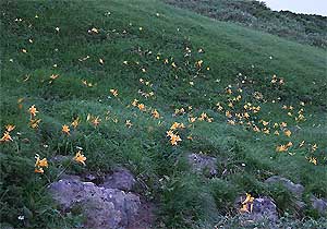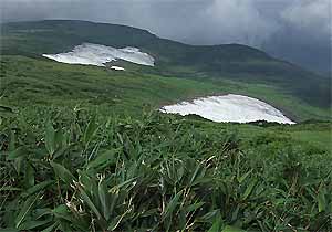 時々ガスが切れ、日が差すこともある。コース左手眼下になだらかに広がる草地の斜面には、この時期、この高度の割に多量の雪渓