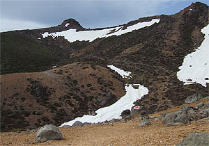 進むあたりには、少規模ながら雪渓も残っているが、歩行を妨げるほどではない。