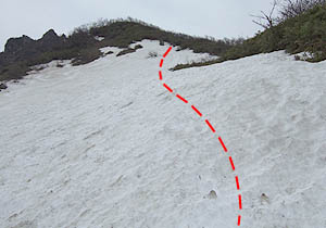 押し倒された潅木がかぶさって歩きにくいこと甚だしい。堪らずコース外の雪渓を歩くことにした。凡そ100m、
