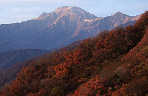 前方に目をやると、朝の赤い光に映える散り残った紅葉の向こうに、越後駒ヶ岳が聳えている。遠い・・・。尻ごみしそうになる