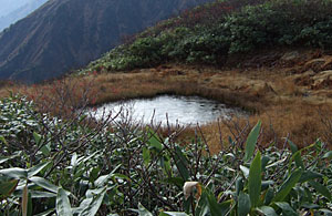 小倉山と越後駒のほぼ中間点に"百草の池"がある。潅木の途切れる低地に広がる草地に、ぽこっとえぐれた直径5mほどの、ほぼ円形の