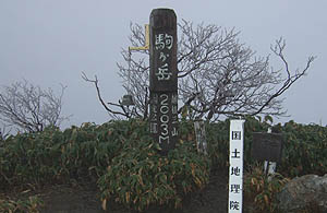 10:10 駒ノ小屋に到着。かろうじて小屋の周りは見渡せるが、山頂はすっぽりガスに巻かれていて、姿は見えない。