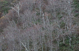 1400〜1500m付近のブナはすっかり葉を脱ぎ捨てて、山肌は透け透けである。雪に覆われるまで、束の間ながら森の底にも光が