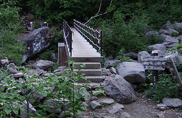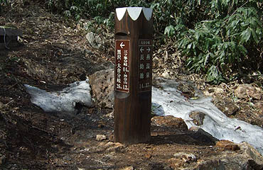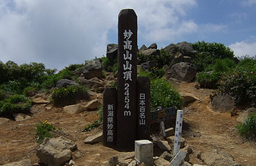 雪渓を過ぎると再び森に入る。急勾配の沢沿いのコースでは、日差しを遮ってくれるが、同時に風も遮断して 甚だ蒸し暑い。30分ほど大汗をかいて森から抜けると、やっと平坦な草地になる。巨石の合間を抜けて小さなアップダウウンを こなしながら進むと、山頂の巨大な標柱に辿り着く。