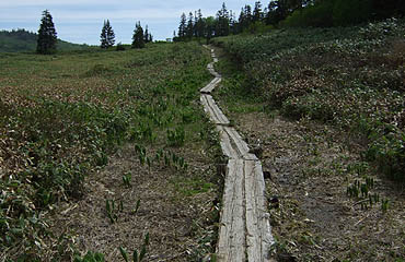 緩やかな下り勾配のコースを辿って、黒沢池に繋がる湿原のヘリに出る。 ここからは木道が敷設されていて歩き易さはグンと向上する。たくさんの春の山野草が見られる。以前飯豊山に登った時、 こうした場面で時間を使い過ぎて下山できなくなったことを思い出し、後ろ髪を引かれつつ先を急ぐ。