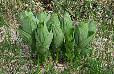 ↑ コバイケイソウの若芽. 早く芽を出したものは霜で黄変している