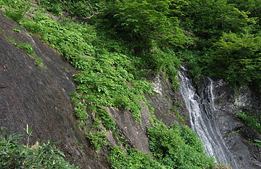 ↑ 普通の山道を1時間ほど辿ると小さなナメ滝に着く。