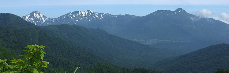 ↑ 八丁ダルミ付近からの遠望。左から焼山(入山規制中)、火打山、妙高山がきれいに見渡せる。