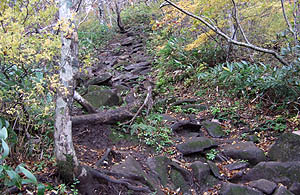 この後、天神平までは勾配は劇的に緩やかになる。これに伴って、コースに泥濘が目立ってくる。勾配のきついところ以外には木道