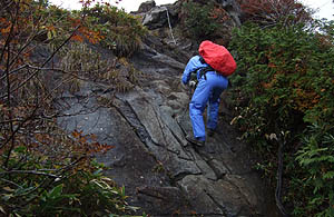 広葉樹の森を抜けると、剥き出しの岩場が始まる。いくつかの鎖場を越えなくてはならないが、やはり足元は滑り易い。