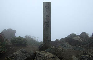 誰もいない山頂で、岩場にカメラを据えてセルフタイマーで記念撮影を済ます。この時点で気温は3℃、一面真っ白で何も見えず、のんびり過ごしたい状況ではない。
