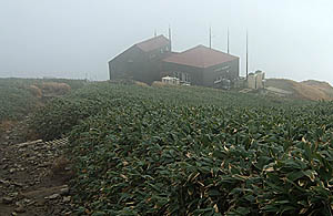中年の女性登山者が2人、ガスの中を散歩(?)しているのに出会った。今夜はこの小屋に泊まり、明日山頂を目指すという。短い