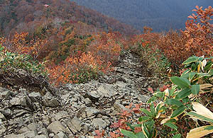 概ね左画像のような、ガレ場の急な下り勾配が続く。