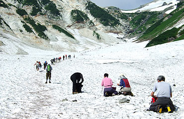 林道や山道を歩いている間は気付かなかったが、いざ大雪渓の開けたところに出てみると、平日と言うのに何と 登山客の多いことか