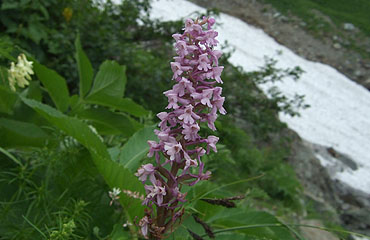 5:57 同乗してきた4人揃って猿倉荘を出発。林道を辿って白馬尻を目指す。この林道の段階で、すでに草花が目に付く様子から、 高山植物の聖地、白馬岳への期待が膨らむ。
