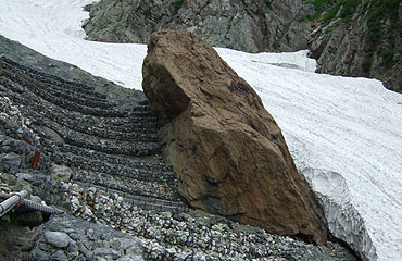 コースの周辺には大小の落石(大は一斗缶、小は拳ほど)が散乱して、緊張を強いている。両側の岸壁からは時々カラカラと乾いた 音をこだまさせて小石が落ちて来るが、大半は雪渓の端のクレパスに阻まれて、コースまで飛び込んで来ることはない。それでも この日の登りの間だけで、2回はコース近傍まで飛んで来た落石があり、肝を冷やされた。