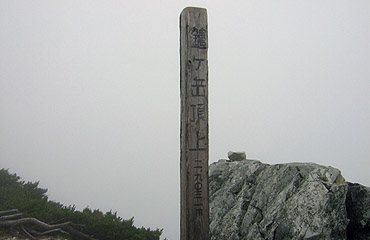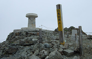 あいにくガスに巻かれて遠景はいうに及ばず、僅か300mほどの距離の白馬山荘も見えない。風景撮影は諦めて、山頂のモニュメントの 撮影と、手近な人にシャッターをお願いして