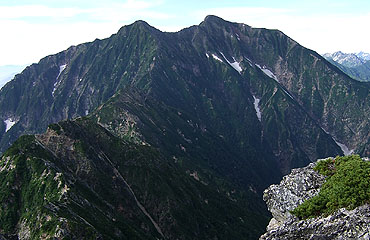 画像の右に写る崖を、時計回りに巻きながら登った先に、八峰キレットが待ち受ける。