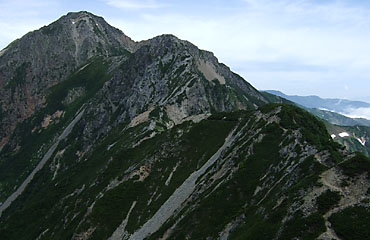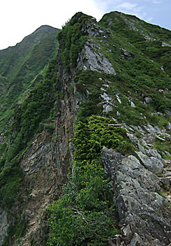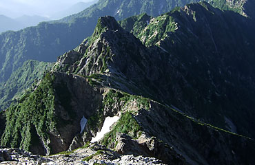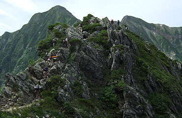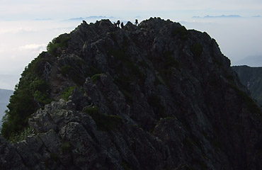 現実はそれほど甘くはなく、起伏に富んだ岩場や痩せ尾根を、登ったり降りたりしながらにじり寄って行くことになる。 終盤には三大キレットの一つ、八峰キレットも待ち受ける。