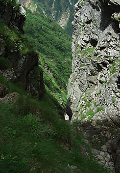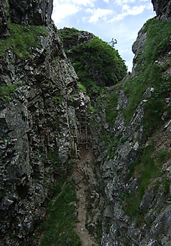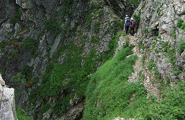 この後、反対の斜面に移り、右下に断崖を見ながら進む。続いて梯子やクサリの助けを借りて壁をよじ登る。両手両足総動員で、 さすがにここではカメラ片手、と言うわけには行かない。