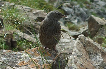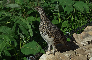 ↑ 種池山荘前の草地に住み着いたライチョウの母さんと