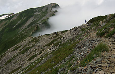 爺ヶ岳まで200mほど登って、あとは扇沢までひたすら下るだけである。ところがこの登りが実にしんどかった。4日間歩き続けて、 脚の筋肉は伸びたゴム紐状態になっているようで、なかなか脚が前に出ない。
