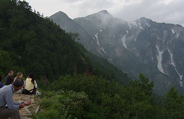 宿泊の手続きを済ませて、日陰の休憩場にでると、同年輩の登山者が席を詰めて、座るよう声を掛けてくれた。好意に甘えて座り込み 雑談に加わった。島根から来たという男性やとその仲間とはすっかり意気投合し、翌日扇沢に下るまで行動を共にすることになった。