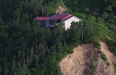↑ 冷池山荘。すぐ近くまで崩落の進む崖が迫る。