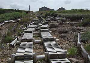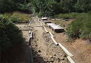 肩で息をしながら、休み休み進むこと約30分で薬師平に到着。木道の設えられた平坦な湿原だ。今は水気を失い乾燥地と化している。