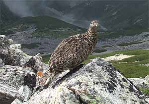 更に40分ほどかかって、避難小屋の残骸を過ぎたところで雷鳥の親子に遭遇。母鳥はコース脇の小高い石の上で鳴き交わしながら