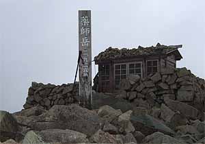 砂浴びショーの後、10分ほどで薬師岳山頂到着。周囲はガスに覆われて、展望は全く利かない。無念!。
