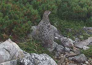 分岐から5分ほど歩いた頃、ここでもライチョウが出迎えてくれた。体長で判断すると成鳥のメスのようだ。2羽いる。他の山で