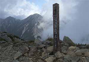 ハイマツ帯に割って入り、岩場を縫って進むこと40分ほどで三俣蓮華頂上に到着。しんどい徘徊だったが、今日予定した3座は全て