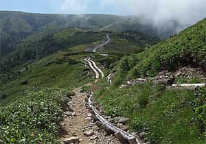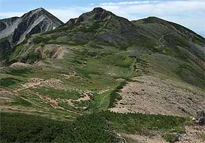 昨日に続き、今日も文句の付けようのない遠望である。一昨日、見えなかった分を取り返すように眺めを楽しんで、小屋を後にする。 まだ時間が早いこともあって下山者は殆どいない。長いアプローチを黙々と歩き、太郎平小屋が見えなくなる直前で見納めの1枚を 撮影(写真)。この先このコースに足を踏み入れることがあるかどうか....