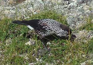 行程の約半分、水晶小屋直下まで来た時、コース脇の草原でホシガラスが何かをついばんでいるところに出会った。距離は4〜5mほど、 登山者に気付いているのか、いないのか。少しずつ場所を変えながら、一心不乱についばんでいる。顔を上げた時、くちばしには 何やら赤い実が挟まっていた。食事の邪魔にならないよう、静かに脇を通り過ぎようと試みたが、この距離以内は彼らには我慢でき ないようで、飛び去ってしまった。