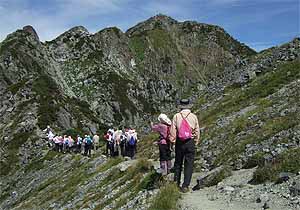 高山帯の山頂付近では高山植物のシーズンはすっかり終わっており、暇人が足を止めて時間をつぶす用件は、今は全くない。この 団体とすれ違った後は、わき目も振らずに歩を進め、ザックを置き去りにしたワリモ北分岐まで戻った。ちょっと勿体なかったか。