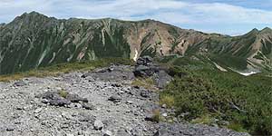 水晶小屋まで来ると右側の視界も大きく開けてくる。真砂岳や野口五郎岳に向けての縦走路が、ノコギリの歯の様な尾根の上を 走り、豆粒のような登山者がコースを辿っているのが見て取れる。