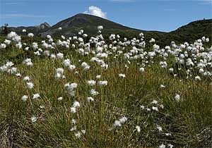木道から少し離れた、干上がった沢の傍にワタスゲの群落があった。ワタボウシをフワフワに広げて、旅立ちの風を待っている ようだ。うまく湿地に着地しろよ!。