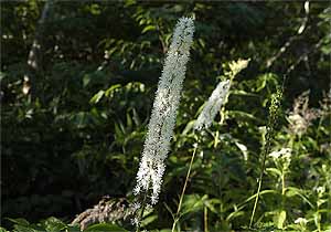 小屋を出て少しだけ急な登りがあるが、それを過ぎるとコースは緩やかなクマザサの茂る木道になる。ところどころ池塘ののように なったところが見受けられるが、ササの繁茂で消滅しかけている。しばらく歩くとササ原がとぎれ、草地に変わる。低地や沢筋には 水が溢れ、湿原の趣を呈している。昨日の雲ノ平とは水事情は大違いだ。サラシナショウマ、